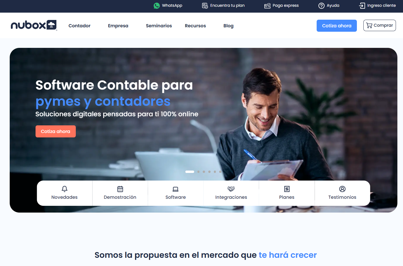 Nubox.com es una empresa tecnológica chilena que ofrece software contable, de facturación electrónica y gestión financiera para pymes. Su plataforma ayuda a digitalizar procesos administrativos y tributarios en Chile, México y Colombia, impulsando la eficiencia y el control financiero de los pequeños negocios en Latinoamérica.